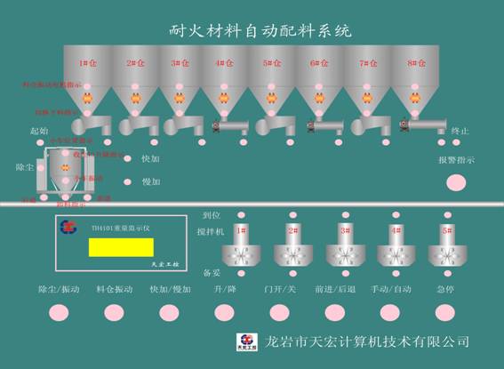 耐火材料生产配料称量及过程控制系统是由龙岩天宏计算机技术有限公司专为耐火材料行业设计开发的控制系统。本系统包含三大部分:配料、工艺监控和远程监控。本系统采用先进的计量技术及控制手段,自动化程度高、实时监控、反馈周期短、采集、控制精度高、提高粉料配比精度、严格按原材料比例控制、操作简单方便,免去了工人大量的数据记录、计算,避免人为误差,配料系统具有手动、自动两种控制模式,降低了工人劳动强度,提高生产效率。