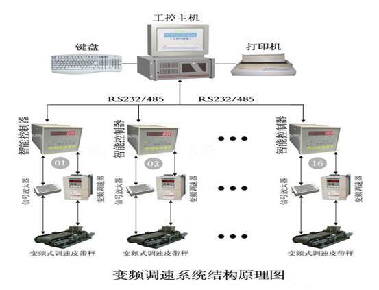 本系统由变频调速秤、进口变频控制器、配料控制器(即下位机)、工业控制计算机(即上位机)等组成。该系统组合灵活、扩展方便、秤群配置最多可达8台以上;现场安装方便、维护维修简单、集强电柜与计算机控制于一体。上位机可以放置在控制现场,也可以放置在 化验室或生产管理办公室。由于该系统采用工业PC作为上位机,因此系统统计、管理功能极强,用户界面十分友好。操作人员只需稍加培训即可独立上岗操作。